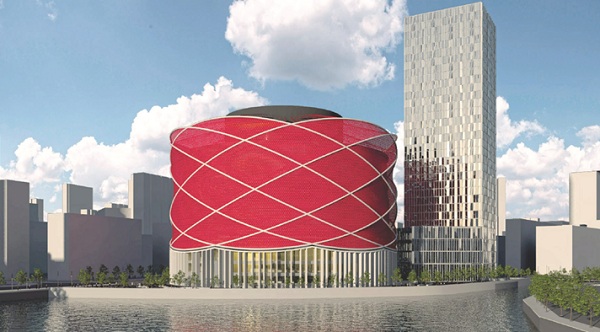 武漢中央文化區(qū)漢秀劇場(chǎng)由萬達(dá)集團(tuán)投資建設(shè),項(xiàng)目位于武漢東湖,是國(guó)內(nèi)第一個(gè)水秀表演場(chǎng)所,造型酷似燈籠,建筑外墻由內(nèi)、外兩層幕墻構(gòu)成,內(nèi)層為直立鎖邊系統(tǒng)及玻璃幕墻系統(tǒng),外層由56榀不規(guī)則輪輻鋼結(jié)構(gòu)及18400個(gè)定位均不相同的中國(guó)紅碟片構(gòu)成燈籠皮裝飾。
