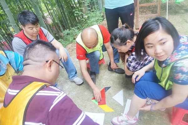 集合、報(bào)數(shù)、整隊(duì)、分組,一行人被分為6組開始不同主題的拓展活動(dòng),學(xué)員們分別進(jìn)行了“國王與天使”、“目標(biāo)市場”、“七巧板”、“團(tuán)隊(duì)動(dòng)力圈”、“挑戰(zhàn)99”、“合力致勝”和“畢業(yè)墻”等拓展科目。