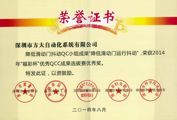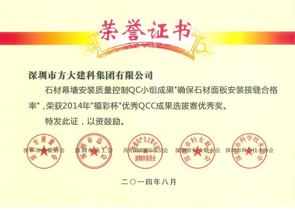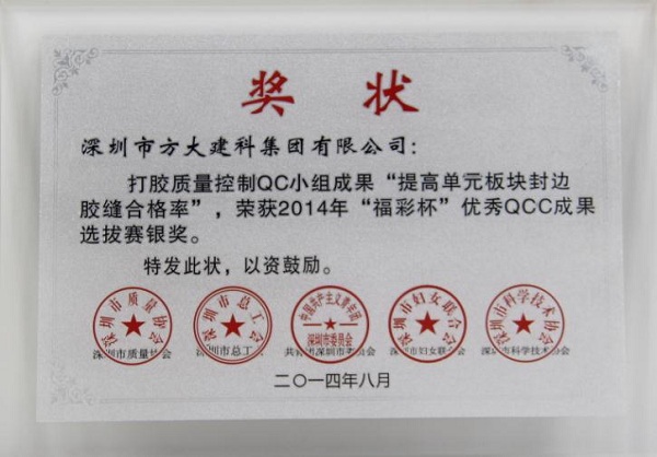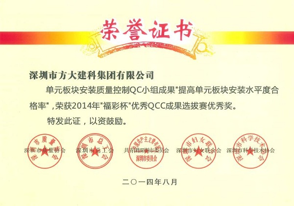 9月26日,方大建科公司獲得由深圳市質(zhì)量協(xié)會(huì)、深圳市總工會(huì)、共青團(tuán)深圳市委員會(huì)、深圳市婦女聯(lián)合會(huì)和深圳市科技技術(shù)協(xié)會(huì)聯(lián)合頒發(fā)的“2014年深圳市質(zhì)量管理小組活動(dòng)優(yōu)秀企業(yè)”稱(chēng)號(hào)。同日,由深圳市質(zhì)量協(xié)會(huì)、深圳市總工會(huì)、共青團(tuán)深圳市委員會(huì)、深圳市婦女聯(lián)合會(huì)和深圳市科技技術(shù)協(xié)會(huì)聯(lián)合評(píng)定的“福彩杯”優(yōu)秀QCC成果優(yōu)秀獎(jiǎng)揭曉。方大建科公司打膠質(zhì)量控制QC小組成果“提高單元板塊封邊合格率”榮獲2014年“福彩杯”QCC成果選拔賽銀獎(jiǎng),方大建科公司單元板塊安裝質(zhì)量控制QC小組成果“提高單元板塊安裝水平度合格率”,方大建科公司石材幕墻安裝質(zhì)量控制QC小組成果“確保石材面板安裝接縫合格率”、 方大自動(dòng)化公司門(mén)機(jī)梁皮帶夾改造QC小組成果“提高門(mén)機(jī)梁傳動(dòng)系統(tǒng)組裝合格率及使用壽命率”榮獲“深圳市2014年‘福彩杯’QCC成果選拔賽優(yōu)秀獎(jiǎng)”, 集團(tuán)公司企業(yè)管理部尚清榮獲“深圳市質(zhì)量管理小組活動(dòng)卓越領(lǐng)導(dǎo)者”稱(chēng)號(hào),方大建科公司張錦德榮獲“深圳市質(zhì)量管理小組活動(dòng)優(yōu)秀推進(jìn)者” 稱(chēng)號(hào)。