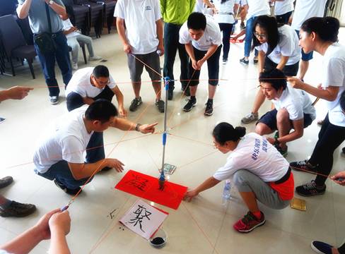 活動需要大家協(xié)作配合共同用繩子拉住一只巨大的毛筆來完成各種風(fēng)格的書法作品。需要團(tuán)隊成員充分發(fā)揮自身優(yōu)勢在協(xié)作中主動承擔(dān)不同的角色并積極主動的進(jìn)行溝通,每一幅作品都是團(tuán)隊智慧與隊員個性的融合。