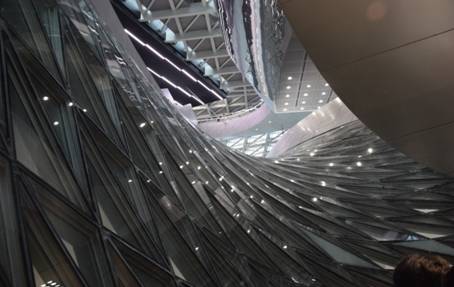 別具匠心體現(xiàn)創(chuàng)新能力。本項(xiàng)目的另一大亮點(diǎn)就是室內(nèi)的云雕塑下方的勺子幕墻系統(tǒng),因?yàn)槠湫螤钕褚话褱锥妹?,其?shí)是一個(gè)雙面雙層扭曲的、兼具防火隔斷功能的室內(nèi)幕墻系統(tǒng),該幕墻的主體異形鋼結(jié)構(gòu)由方大人設(shè)計(jì)、施工完成,工期只用了30天。