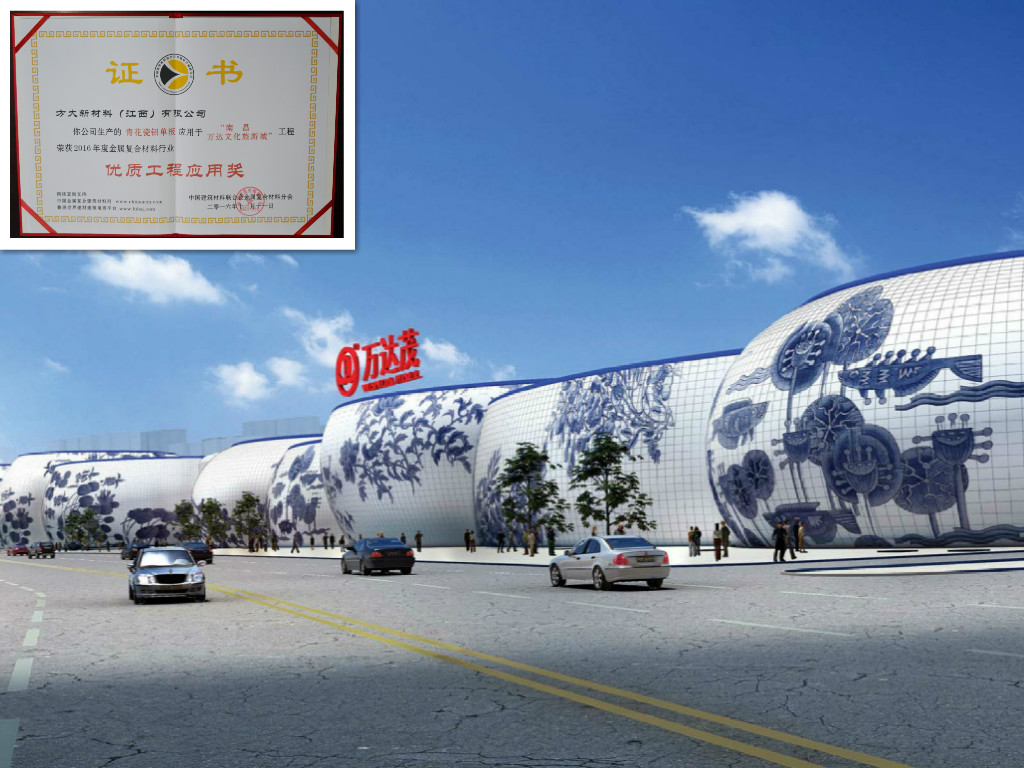 方大青花瓷鋁單板應用于南昌萬達文化旅游城,榮獲2016年度金屬復合材料行業(yè)“優(yōu)質工程應用獎”