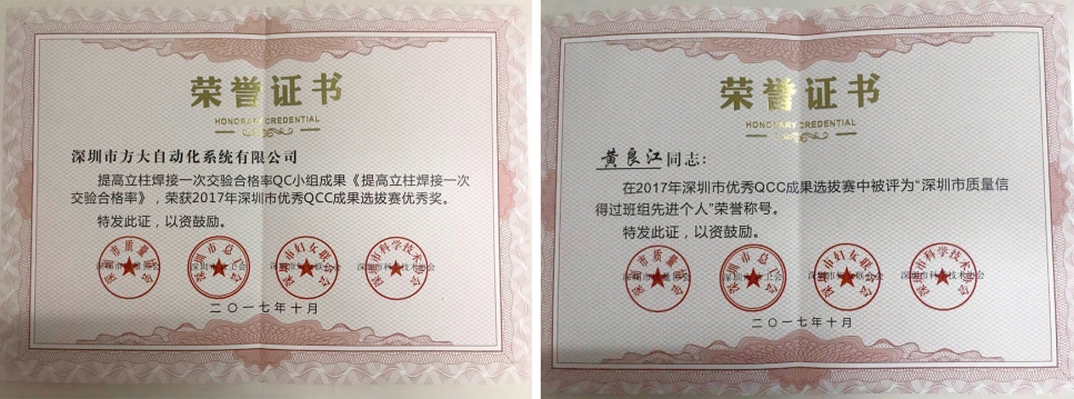 11月14日,深圳市第三十屆優(yōu)秀質(zhì)量管理小組活動表彰大會在深圳市建科院舉行,方大集團(tuán)股份有限公司全資子公司深圳市方大自動化系統(tǒng)有限公司“提高立柱焊接一次交驗(yàn)合格率QC小組”榮獲“2017年深圳市優(yōu)秀QCC成果選拔賽優(yōu)秀獎”,自動化公司質(zhì)量安全部黃良江榮獲“深圳市質(zhì)量信得過班組先進(jìn)個人”榮譽(yù)稱號。