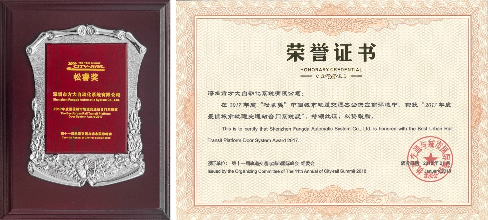 1月10日,第十一屆軌道交通與城市國際峰會在深圳舉行,峰會對在軌道交通行業(yè)有突出貢獻的企業(yè)進行了表彰,方大集團股份有限公司全資子公司深圳市自動化系統(tǒng)有限公司獲頒“2017年度最佳城市軌道交通站臺門系統(tǒng)獎”?!八深*劇笔侵袊鞘熊壍澜煌▋?yōu)秀供應(yīng)商獎,嘉獎和推介在軌道交通領(lǐng)域具備創(chuàng)新技術(shù)和做出杰出貢獻的企業(yè)。