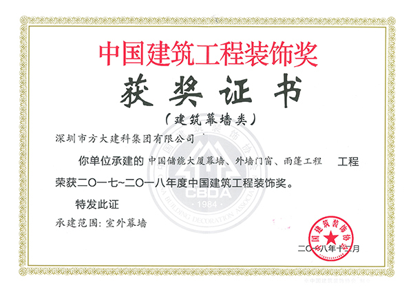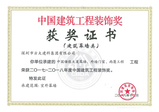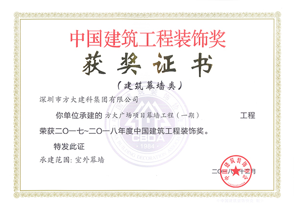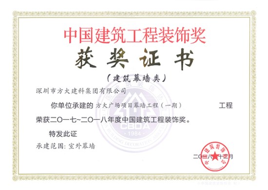 中國建筑工程裝飾獎是由中國建筑裝飾協(xié)會主辦的評選活動,自2001年起每年進(jìn)行評選,是建設(shè)部批準(zhǔn)設(shè)立的中國建筑裝飾行業(yè)的最高榮譽(yù)獎。方大建科承建的四項(xiàng)幕墻工程獲此獎項(xiàng),是對公司精湛的幕墻設(shè)計能力和先進(jìn)的施工工藝的充分肯定。