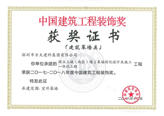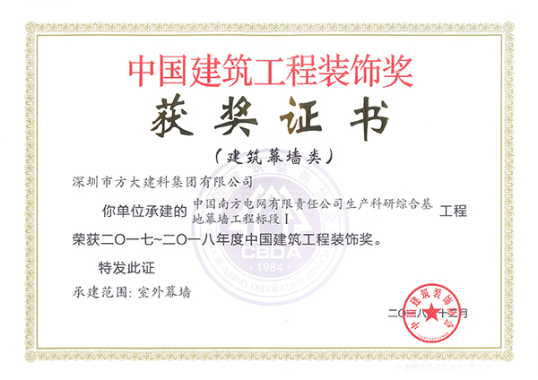近日,中國建筑裝飾協(xié)會頒發(fā)了2017-2018年度中國建筑工程裝飾獎的獲獎證書,方大集團(tuán)股份有限公司全資子公司深圳市方大建科集團(tuán)有限公司承建的四項(xiàng)幕墻工程榮獲中國建筑工程裝飾獎——方大廣場(一期)、深業(yè)上城(南區(qū))塔2、中國儲能大廈、中國南方電網(wǎng)有限責(zé)任公司生產(chǎn)科研綜合基地。