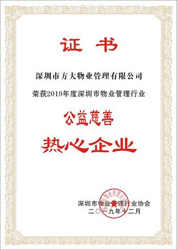 2019年度深圳市物業(yè)管理行業(yè)“優(yōu)秀企業(yè)”、“公益慈善熱心企業(yè)”評選由深圳市物業(yè)管理行業(yè)協(xié)會(huì)主辦,旨在鼓勵(lì)各物業(yè)管理企業(yè)積極開展扶貧、濟(jì)困捐助等公益活動(dòng),樹立模范典型,發(fā)揮榜樣示范作用,促進(jìn)物業(yè)管理水平的提高,同時(shí)帶動(dòng)更多的企業(yè)和從業(yè)人員,高質(zhì)量地推進(jìn)行業(yè)發(fā)展。此次榮獲“優(yōu)秀企業(yè)”、“公益慈善熱心企業(yè)”兩個(gè)獎(jiǎng)項(xiàng),表明對方大物業(yè)及公司公益慈善工作的肯定。