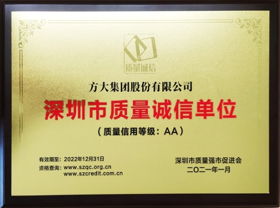 近日,深圳市質量強市促進會公布了質量誠信(示范)單位認定名單,方大集團獲得“深圳市質量誠信單位”認證。