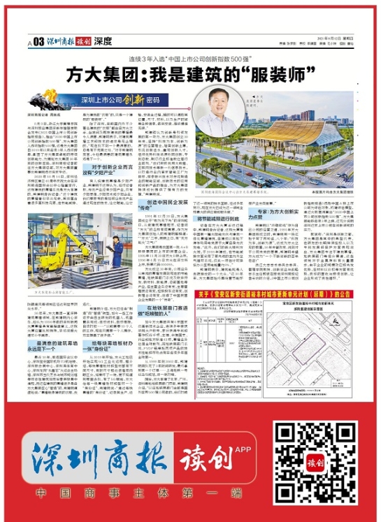 8月9日,浙江大學管理學院與深圳報業(yè)集團深新傳播智庫聯(lián)合發(fā)布《2021中國上市公司創(chuàng)新指數(shù)報告》,推出“2020中國上市公司創(chuàng)新指數(shù)500強”。方大集團入選該指數(shù)500強,這是方大集團自2019年以來連續(xù)3年入選該榜單,彰顯了方大集團卓越的持續(xù)創(chuàng)新能力。為揭秘方大集團30年來的創(chuàng)新密碼,深圳商報記者前往方大集團總部,對方大集團董事長熊建明進行獨家專訪。